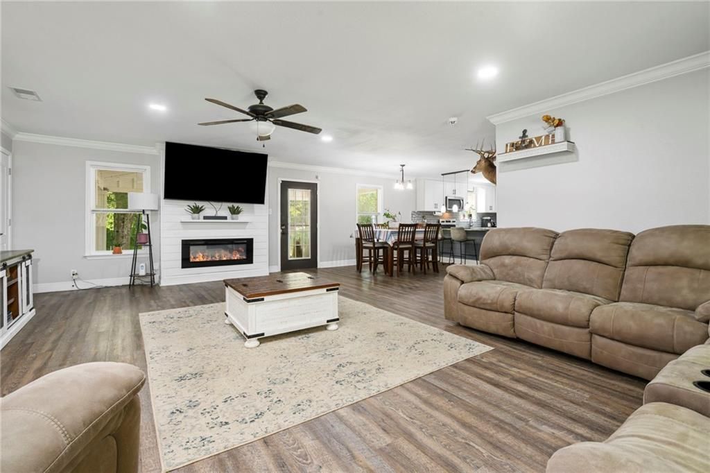 Updated and impeccably maintained 4 bedroom, 2 bath home offering the perfect blend of modern upgrades, functional design, and peaceful outdoor living. This thoughtfully designed home features an open concept kitchen and living area ideal for everyday living and entertaining, along with a desirable split bedroom floor plan that enhances privacy for the primary suite. Recent renovations and improvements are evident throughout and include luxury vinyl plank flooring with no carpet, upgraded lighting, and a warm, inviting electric fireplace that anchors the main living space. The spacious kitchen has been beautifully updated with marble countertops, stainless steel appliances, ample cabinetry, and generous workspace, making it both stylish and highly functional. Both bathrooms have been upgraded with modern finishes, offering a fresh and move in ready feel.Situated on 1.16 acres of peaceful, rural living, the outdoor space is truly a standout feature of this property. The fully fenced backyard is designed for relaxation and entertaining, featuring a large, covered patio perfect for outdoor dining, a large swimming pool, and a dedicated pool house complete with a sink, toilet, and pool storage. A separate storage shed with an overhang provides convenient space for lawn equipment and tools. The expansive yard includes manicured green space ideal for pets, play, or gatherings, as well as a large concrete pad perfect for storing recreational vehicles, boats, ATVs, or trailers-a rare and valuable feature. Parking is plentiful with a one car garage and two separate driveways accommodating up to six vehicles, offering flexibility for homeowners and guests alike.This property delivers privacy, space, and modern comfort while remaining functional and versatile for a variety of lifestyles. A rare opportunity to enjoy updated interiors paired with an exceptional outdoor setup-this home is truly ready to be enjoyed from day one. All measurements are approximate and not guaranteed, buyer to verify.