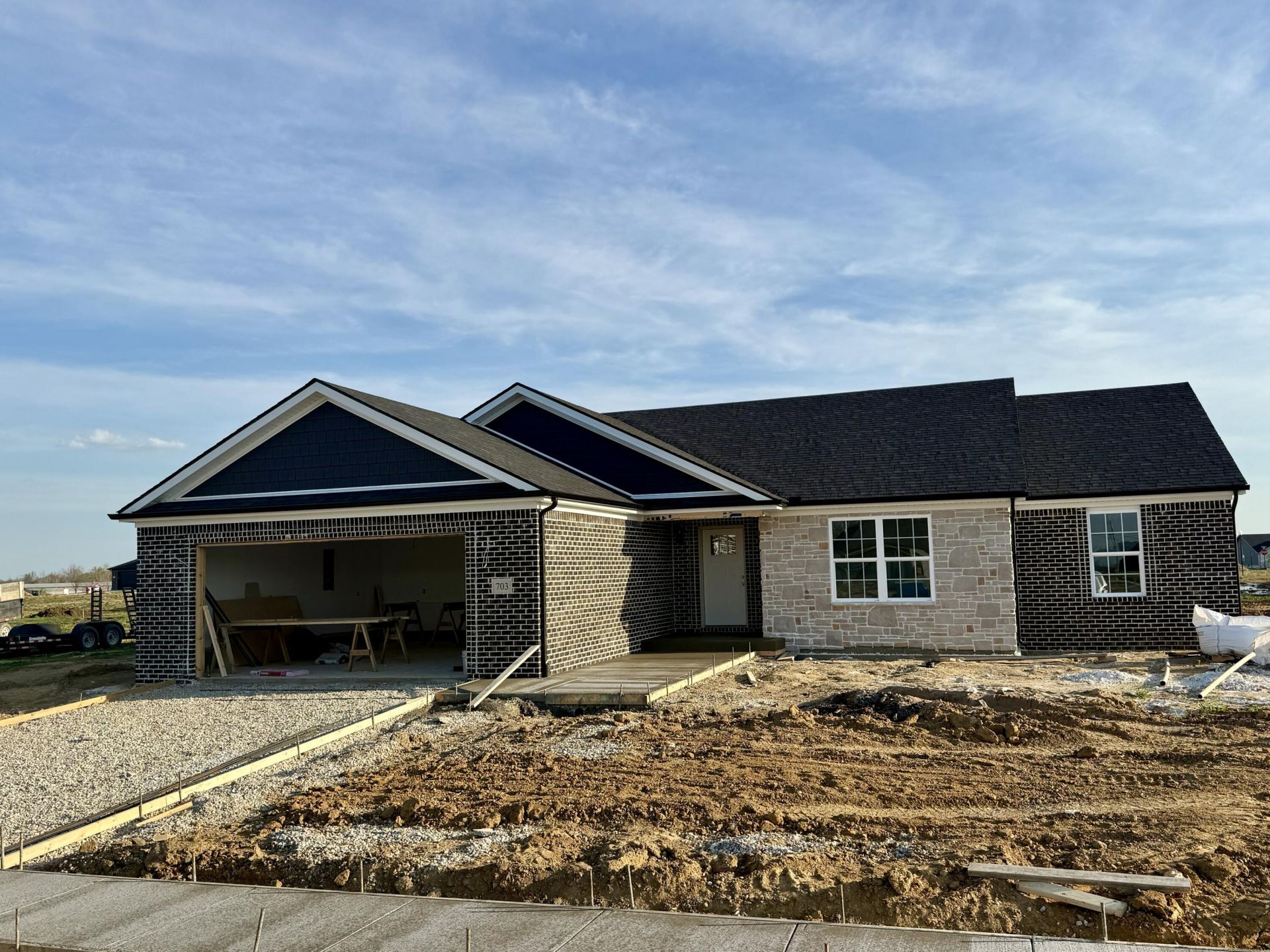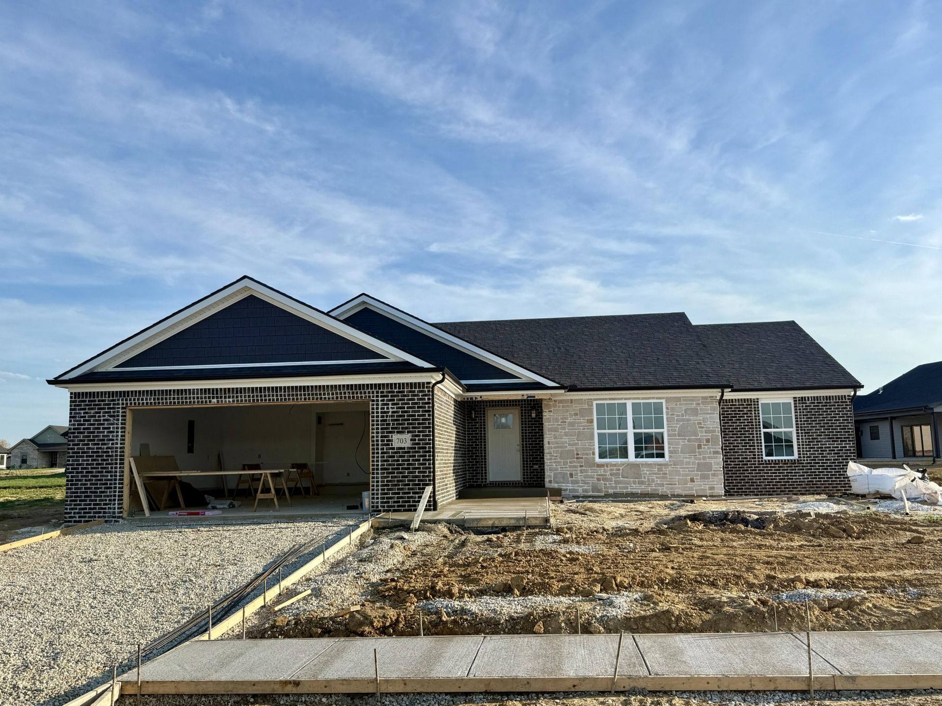 TThis beautifully crafted 4BR/2BA ranch-style home, set for completion in May 2026, is a rare find on a level 0.21-acre lot. The exterior showcases striking brick and stone! Inside, the plan is designed as a perfect space for all - a spacious, carpet-free layout with luxury vinyl plank and tile flooring, complemented by meticulous custom wood detail work throughout. A welcoming foyer opens into a generous living area highlighted by coffered 10-foot ceilings and a sleek electric fireplace. The gourmet kitchen is a true centerpiece, offering an oversized island, quartz countertops, stainless steel appliances, adjacent pantry, and a large dining area overlooking the level backyard and covered patio???perfect for entertaining or everyday life. The split-bedroom floor plan provides privacy, with a luxurious primary suite featuring a tiled walk-in shower, double vanities with quartz countertops, and custom wood detailing. Three additional generously sized bedrooms are located on the opposite side of the home. Additional highlights include a covered rear patio, a spacious utility room and an oversized two-car garage, providing ample storage and convenience. Lot #161